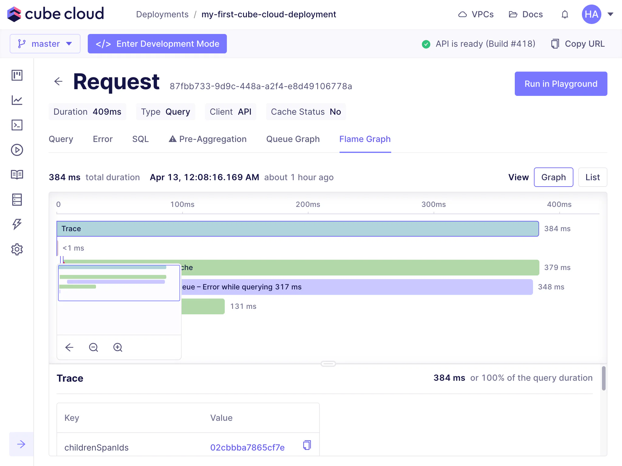 The Flame Graph tab shows a flame graph  of a query’s execution time across resources in the Cube Cloud deployment. This is extremely useful for diagnosing where time is being spent in a query, and can help identify bottlenecks in your Cube deployment or data source.